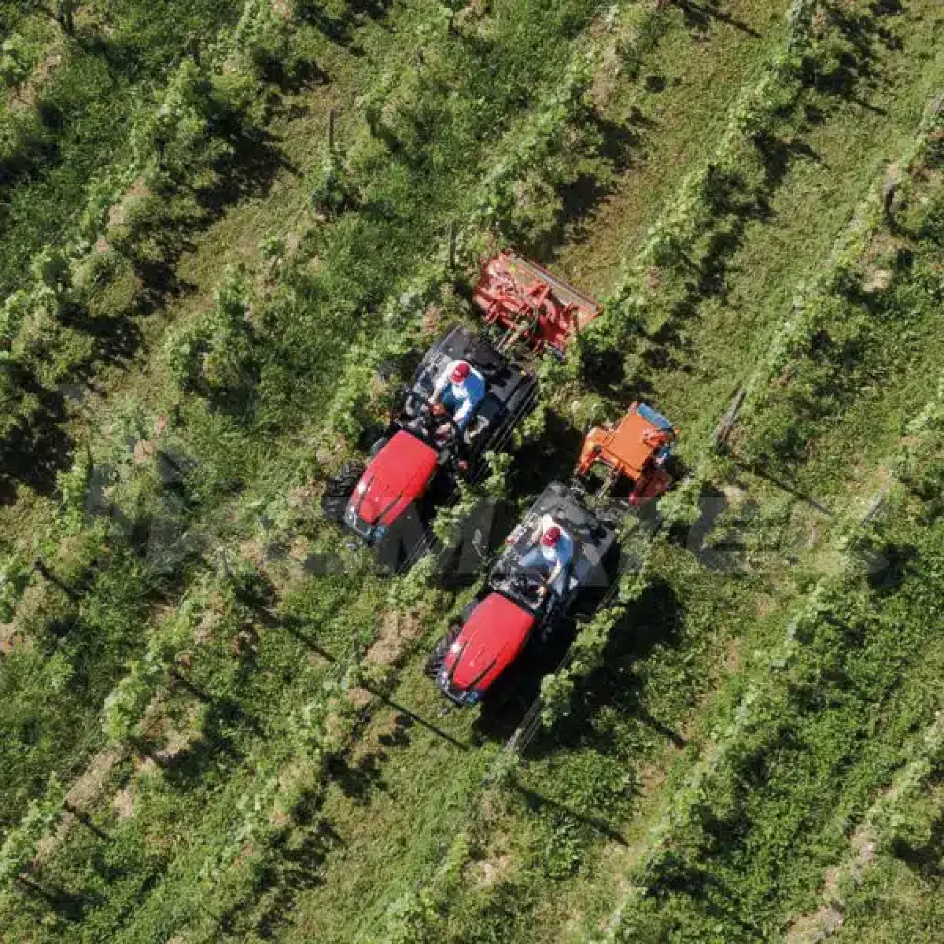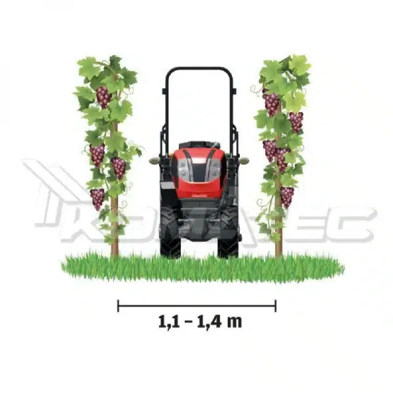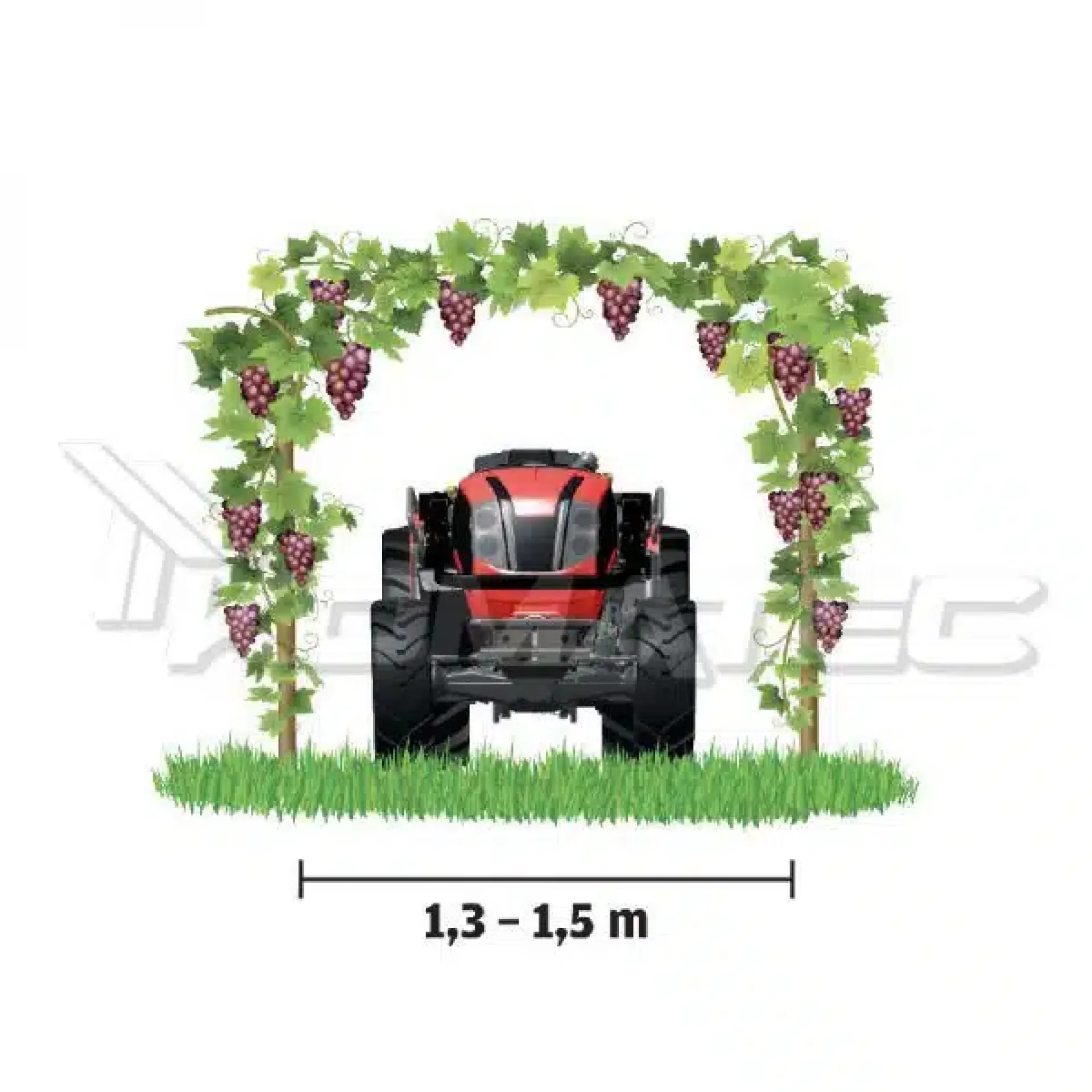 Úzké vinice, pergolové systémy a sady s nízkou korunou; práce v řádcích (postřik, kultivace, mulč), manévry v těsných uličkách, práce pod větvemi/listovím.
