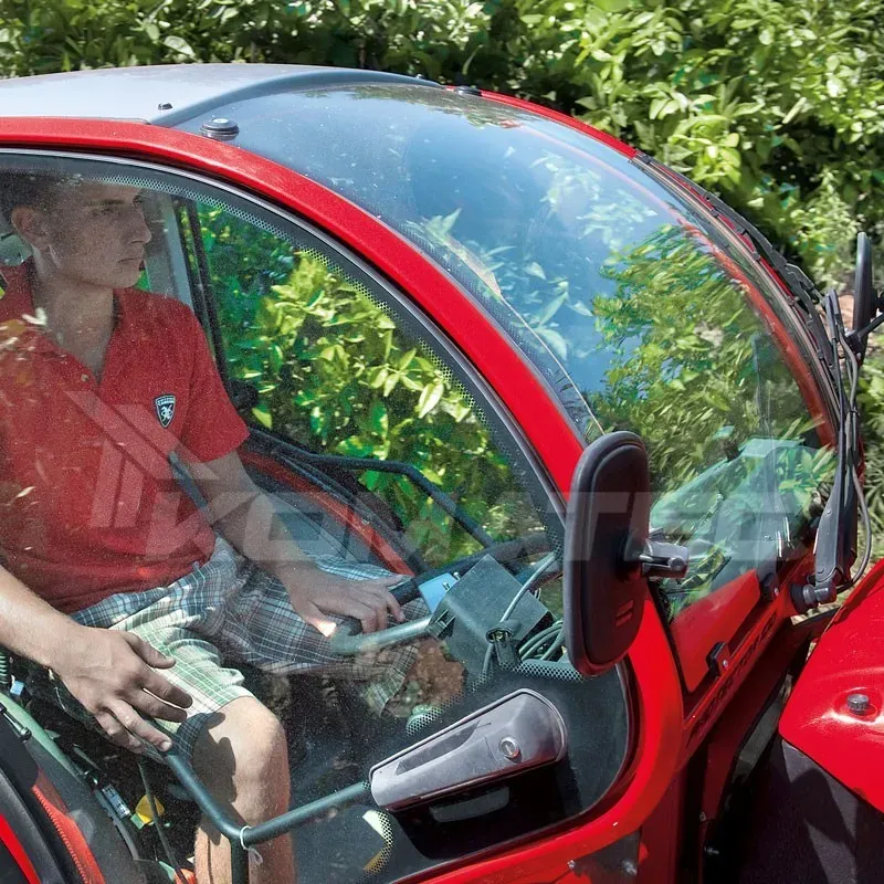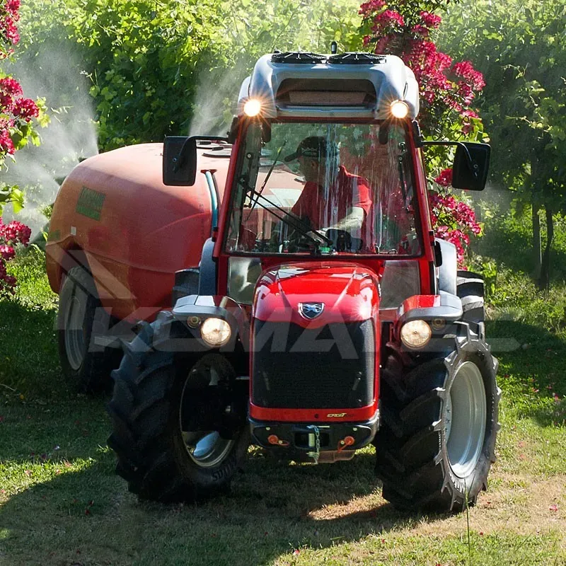 TGF 7800 Ergit S je nízkoprofilový traktor se řízenou přední nápravou a rozdílně velkými koly. Díky velmi nízké stavbě zvládá tunely, porosty s nízkou korunou a strmé svahy – bez poškození listů. Nabízí Protector (super nízká, přetlak Kat. 4) nebo StarLight (panoramatická) kabinu, dle prostředí a ochrany obsluhy.