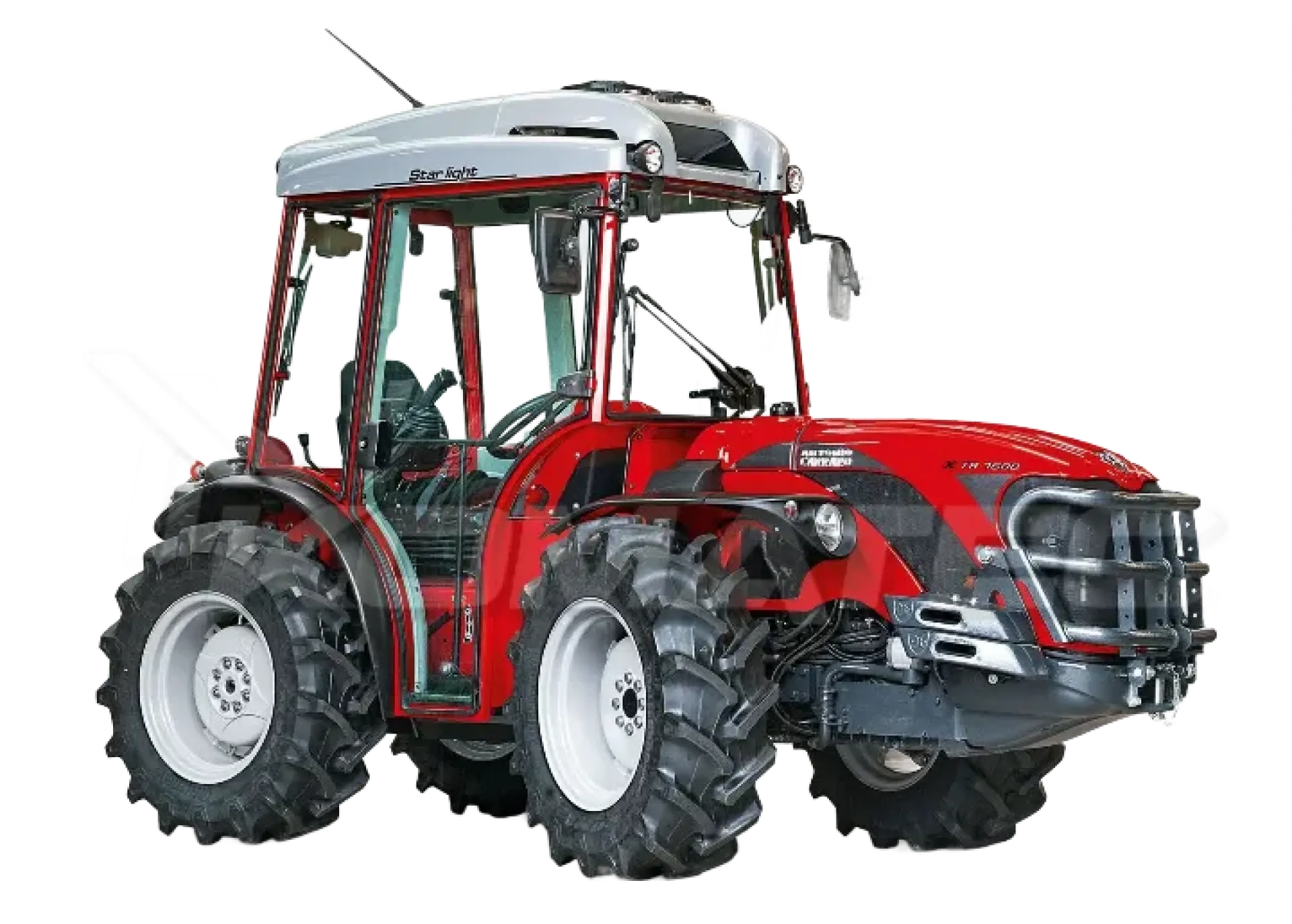 TR 7600 Infinity je izodiametrický traktor s řízenou přední nápravou a reverzním řízením, který kombinuje mechanickou a hydrostatickou část převodu do chytré „hybridní“ jednotky Infinity. Umí stejné pracovní rychlosti vpřed i vzad (0–40 km/h), reverz na volantu kdykoli, 2 mechanická pásma × 3 hydrostatické rychlosti řaditelné za jízdy bez ztráty trakce. Díky kompaktním rozměrům a isokolům je jako doma v úzkých vinicích/sadech a stísněných areálech, ale zvládá i údržbu zeleně, čištění komunikací, sečení náspů či práci na svazích. Volitelná kabina StarLight nabízí plnohodnotný komfort a výhled 360°.