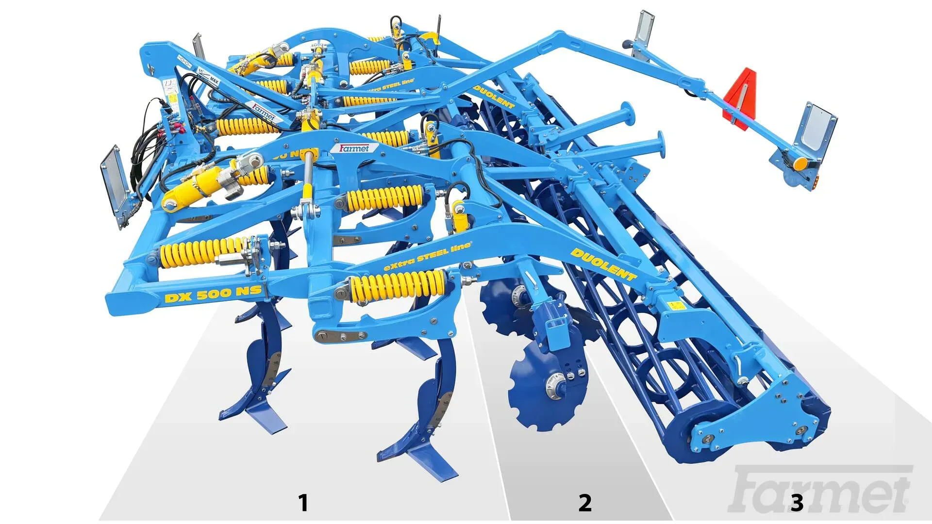 DUOLENT NS je nesený dvouřadý dlátový kypřič určený pro intenzivní zpracování půdy s dobrou průchodností materiálu. Vhodný je zejména pro podniky hledající univerzální stroj s nižšími nároky na výkon traktoru při zachování kvalitního promíchání půdy.
