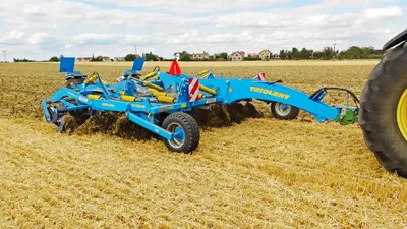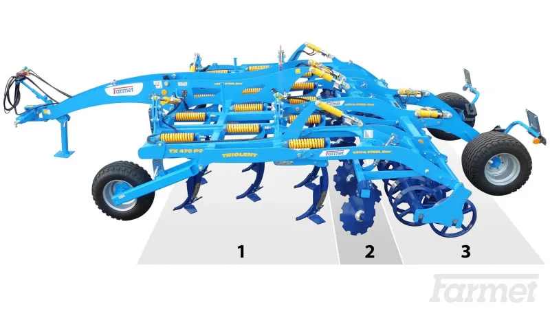 TRIOLENT PS je tažený třířadý dlátový kypřič určený pro kvalitní podmítku i hlubší kypření při vysokých pracovních rychlostech. Konstrukce stroje zajišťuje vysokou průchodnost materiálu a rovnoměrné promíchání půdy i při velkém množství posklizňových zbytků.