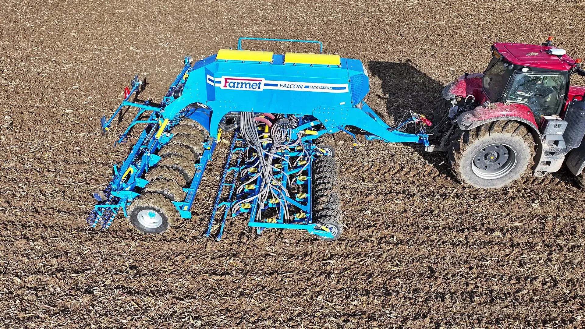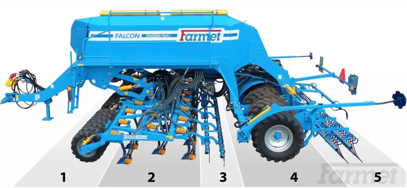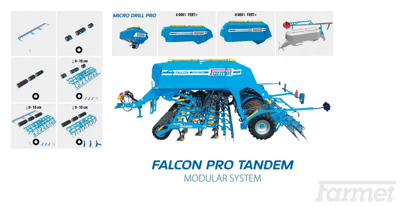 FALCON PRO TANDEM je výkonný secí stroj kombinující předzpracování půdy a výsev pomocí radličkových secích botek uložených v tandemovém systému. Konstrukce zajišťuje stabilní vedení secích botek, rovnoměrnou hloubku setí a vysokou spolehlivost i v těžších půdách.